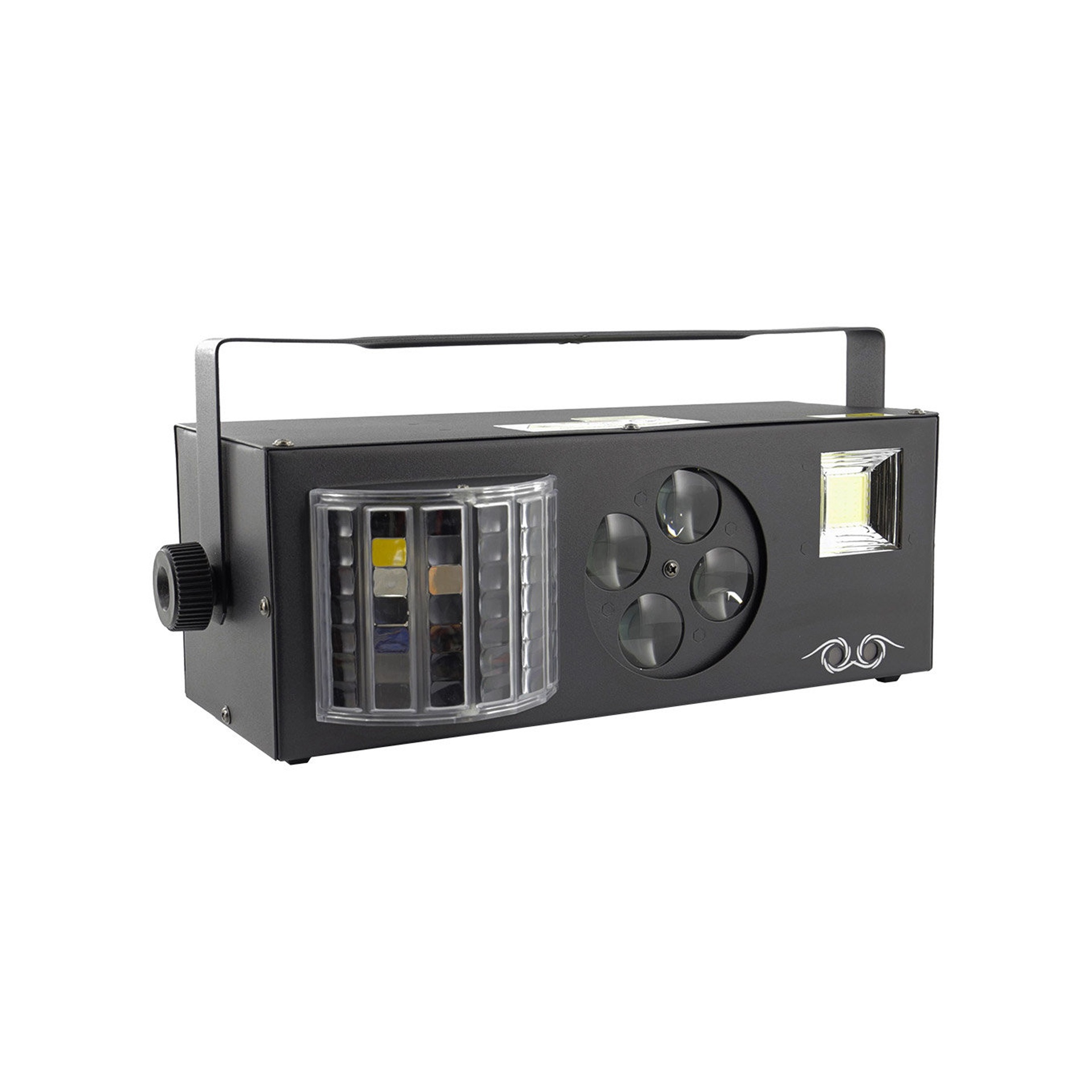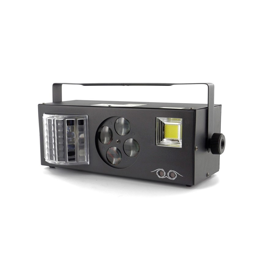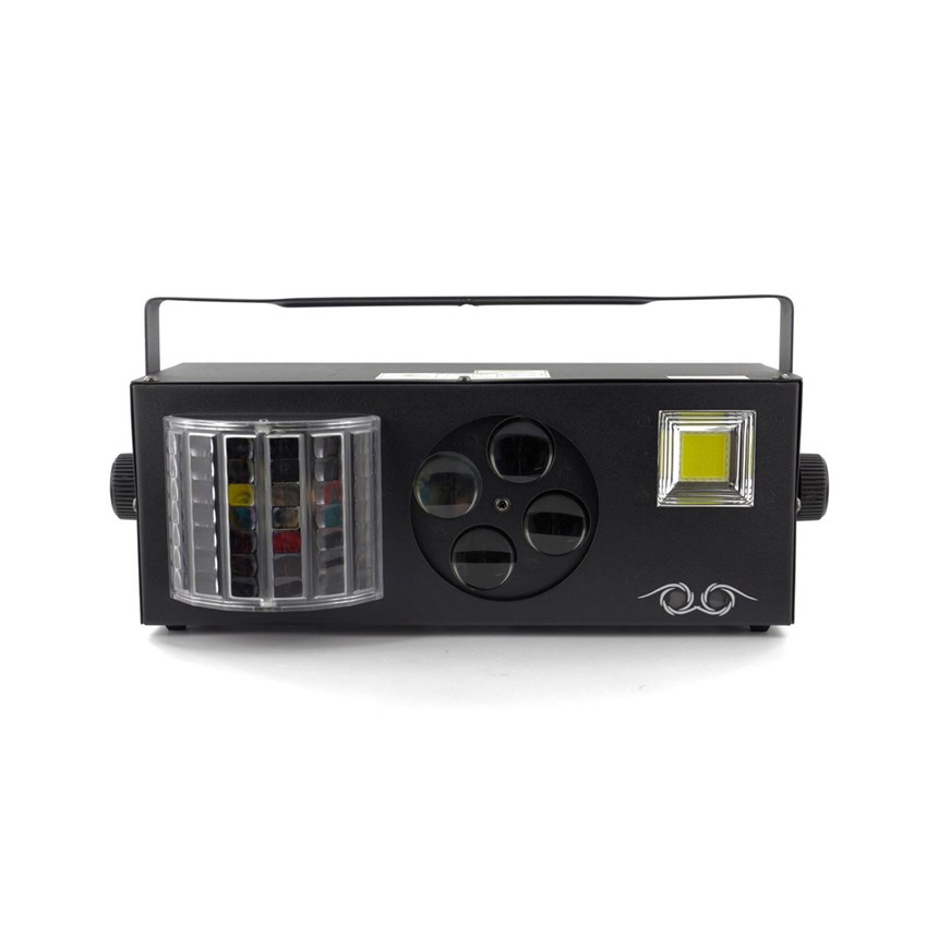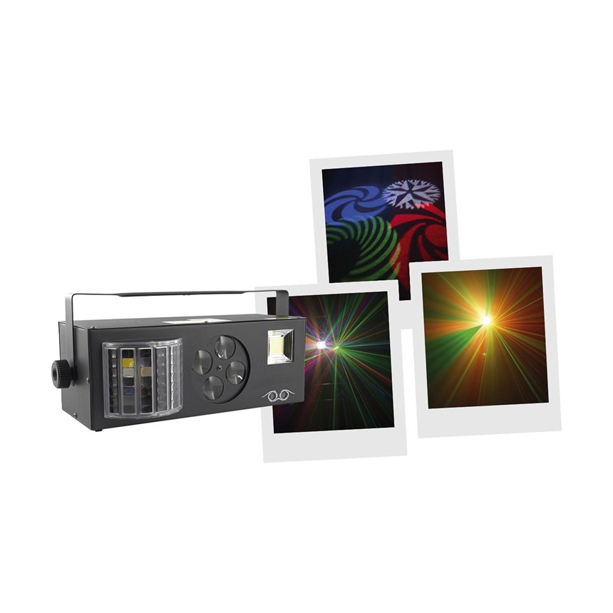 UN SPECTACLE LUMINEUX COMPLET EN UN SEUL APPAREIL.Profitez de 4 effets lumière combinés : LASER vert et rouge, stroboscope puissant, gobos animés et Derby RGBW. Facile à contrôler en mode DMX, automatique ou via détection sonore, ce jeu de lumière couvre 120° pour une ambiance immersive. Compact et performant, il transforme vos événements en véritables shows professionnels. Commandez maintenant !