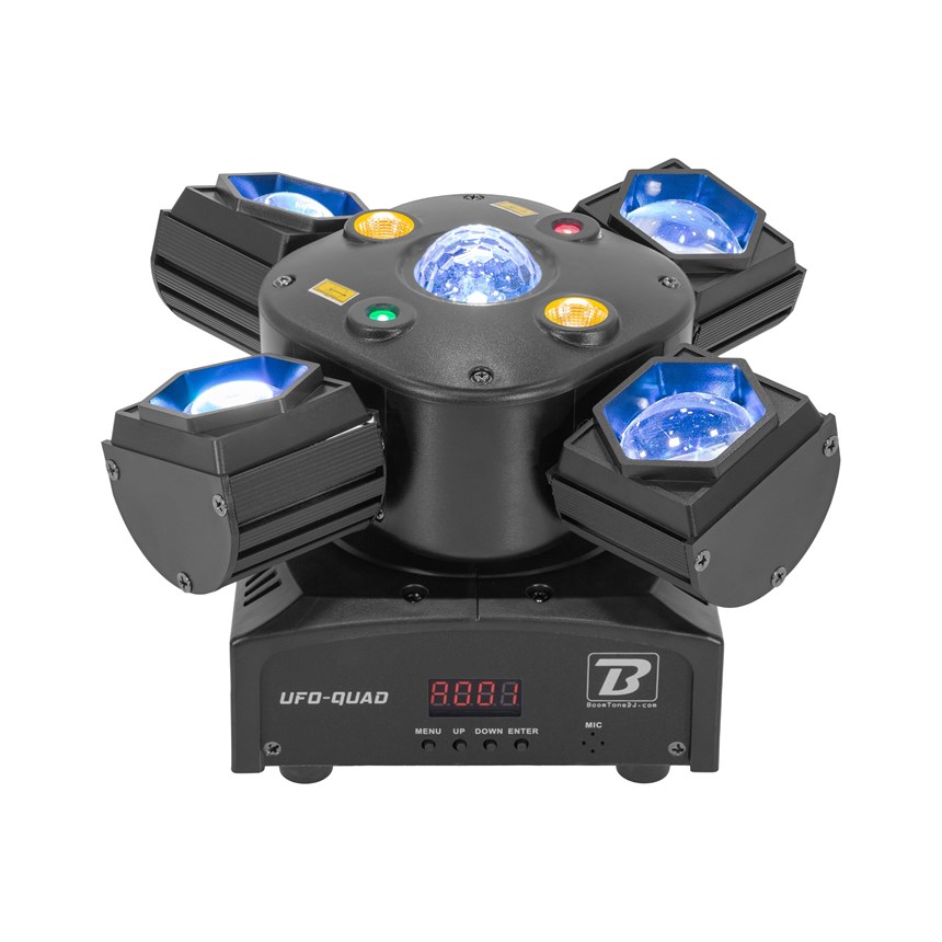 UN SHOW LUMINEUX MULTI-EFFETS DANS UN FORMAT COMPACT : Le BoomTone DJ UFO-Quad regroupe 4 effets spectaculaires (Laser, Beam, Strobe, Disco) dans un seul appareil pour sublimer vos soirées.Équipé de LEDs puissantes et d’un double laser, il fonctionne en DMX, auto ou au rythme de la musique. Compact, léger et facile à installer, il est l’outil idéal des DJs mobiles et des animations festives sans prise de tête.