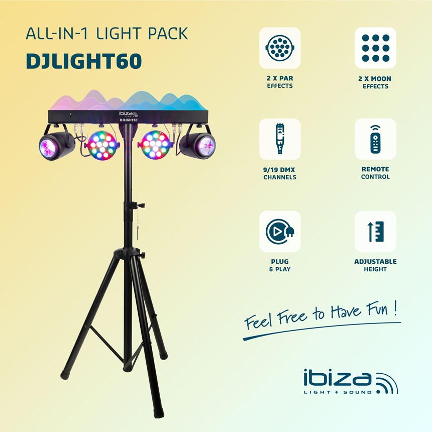 UN KIT D'ÉCLAIRAGE ÉVOLUTIF POUR AMBIANCES FESTIVES ET ÉVÉNEMENTS.Le DJLIGHT60 combine puissance lumineuse, effets variés et installation rapide pour dynamiser vos soirées en un clin d’œil.
