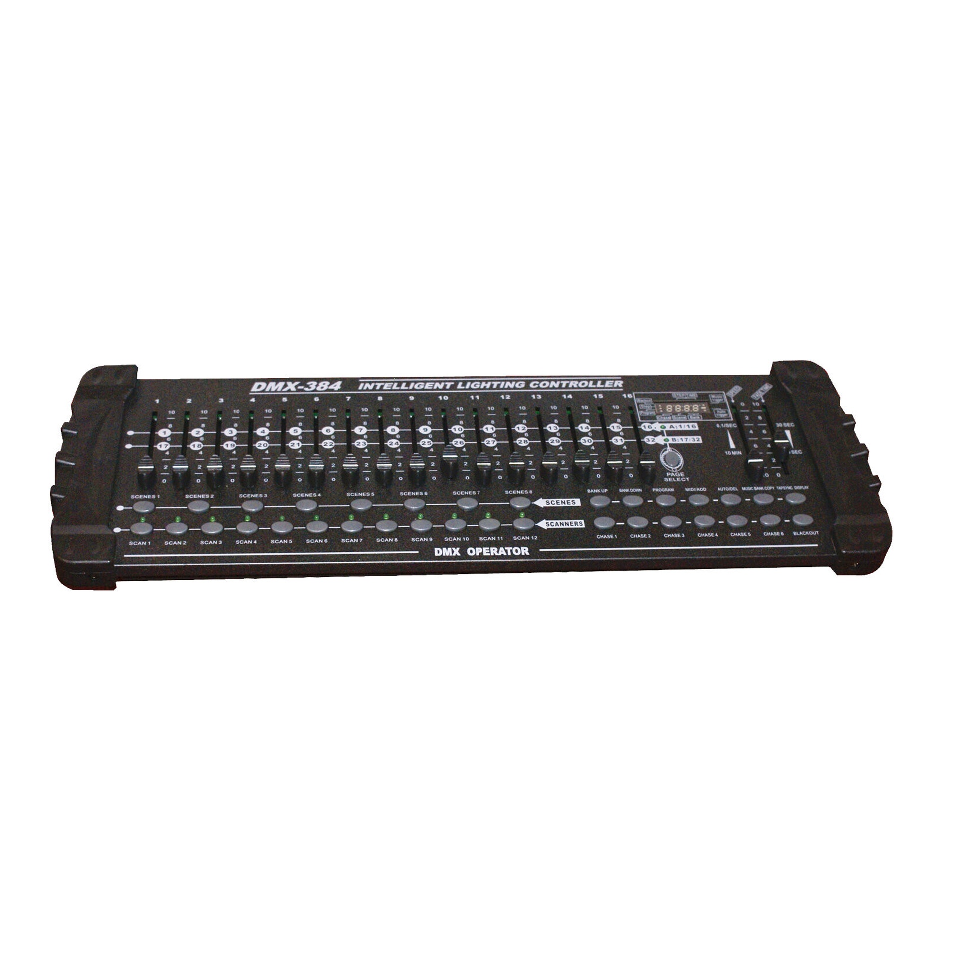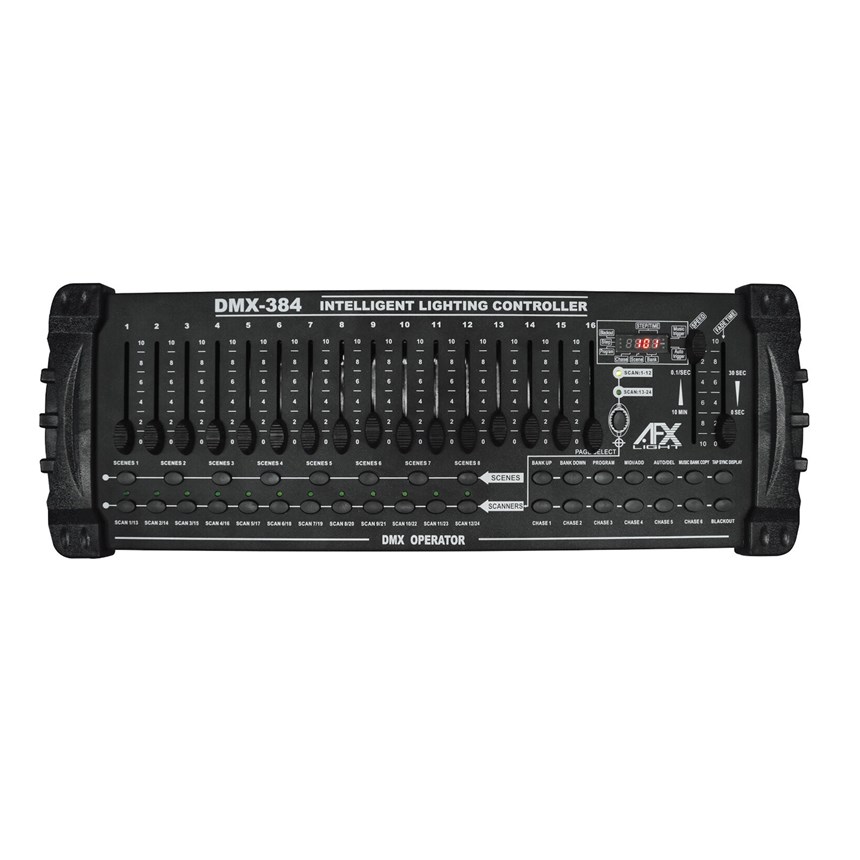 CONSOLE DMX 384 CANAUX : Pilotez jusqu’à 24 appareils (16 canaux chacun) avec une flexibilité maximale.Programmez 240 scènes réparties en 30 banques et jusqu’à 6 séquences complètes. Grâce à ses 16 faders, son déclenchement MIDI et sa détection musicale intégrée, cette console compacte est l’outil idéal pour vos shows. Livrée avec flexible lumineux USB pour un confort optimal.
