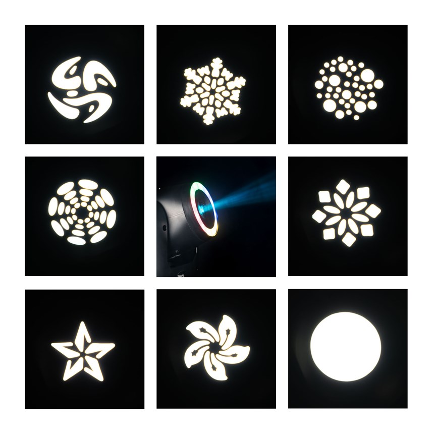 - EFFETS GOBOS COMPLETS : Roue avec 7 gobos + ouvert, incluant les effets 'gobo shake' et 'gobo flow' pour enrichir vos projections et créer des animations en mouvement.