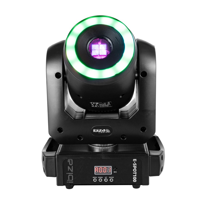 - SPECIFICATIONS : 15 canaux DMX - Plateau de lentilles rotatif - Mouvement Pan de 540° - Mouvement Tilt de 190° (avec réglage fin 16-bit) - Afficheur à LED - Dimmer - Connecteur d'alimentation Powercon - Ouverture Spot de 13° - 7 gobos + blanc, gobo shake, gobo flow effect - Spot: 1x white 100W LED; Wash ring: 12 x 0.3W 5050 RVB 3-in-1 LEDs