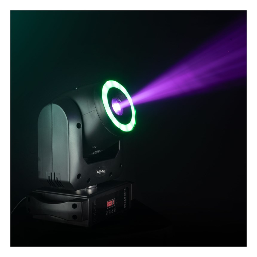 PUISSANCE ET COULEURS POUR DES SHOWS ÉCLATANTS ! Cette lyre compacte associe une LED blanche 100W à un Anneau/ring de 12 LED RVB dynamiques pour un rendu visuel impressionnant sur scène ou en soirée.