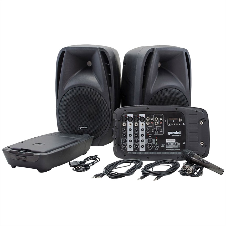 PUISSANCE ET SIMPLICITÉ TOUT-EN-UN.Le Gemini ES-210MX-BLU offre une sonorisation complète et portable, avec 2 enceintes 10” et une console de mixage amplifiée 4 voies intégrée. Grâce à ses 600 W crête, sa connectivité Bluetooth et son lecteur multimédia USB/SD, il est idéal pour les événements, animations et présentations.