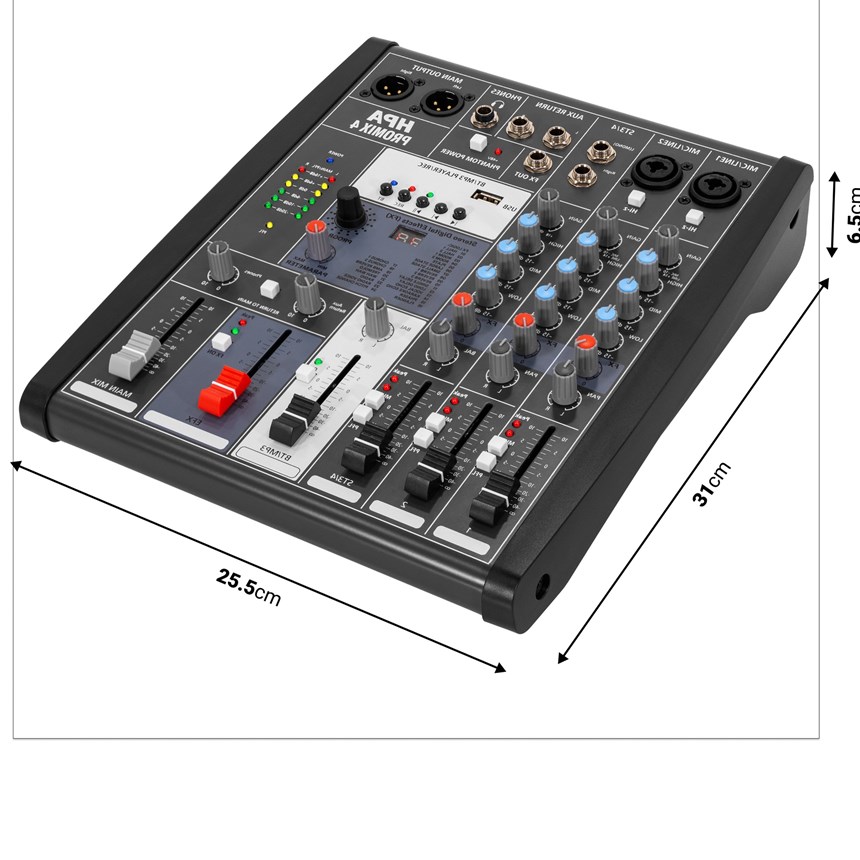 PUISSANCE AUDIO COMPACTE – La HPA Promix 4 offre 4 canaux avec entrées micro/ligne et stéréo, DSP 24 effets réglables, enregistrement USB 24 bits/48 kHz et lecture MP3 via Bluetooth, USB et carte SD.Fidélité audio 20 Hz–20 kHz, alimentation fantôme +48 V et connectiques pro pour un mixage précis en studio ou en live. La performance professionnelle dans un format portable !