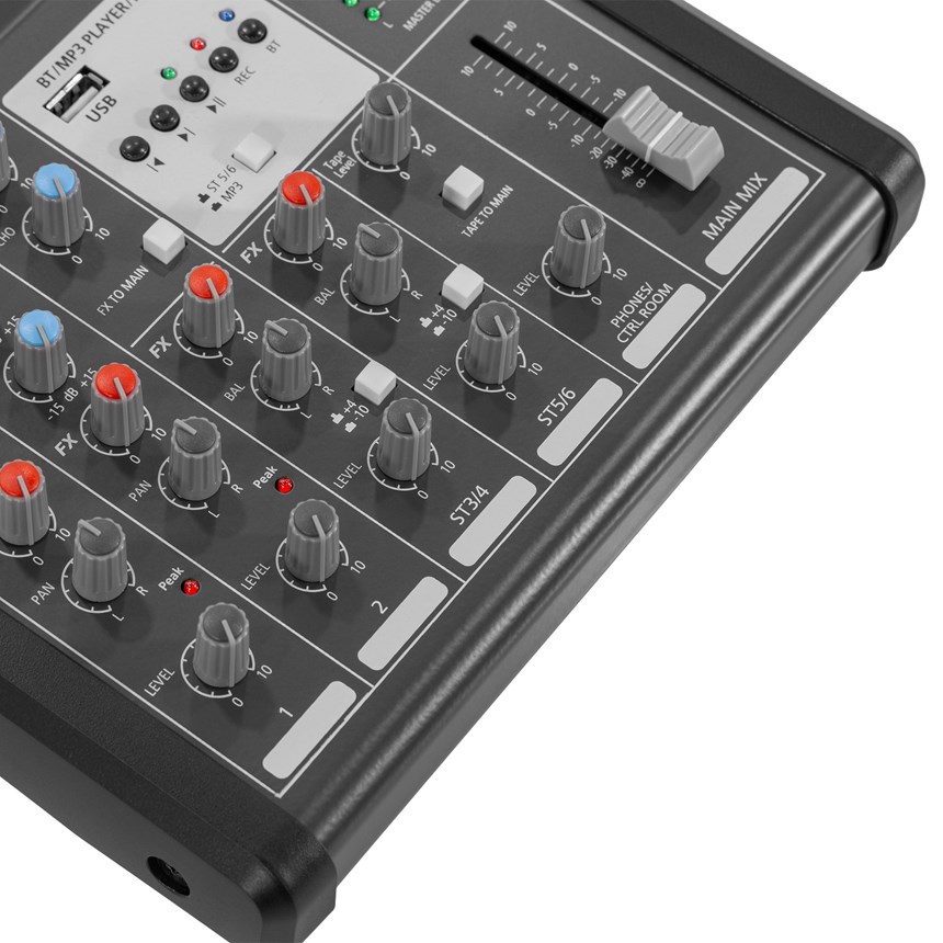 - CANAUX ET ENTRÉES: 6 canaux comprenant 2 entrées micro XLR (avec alimentation fantôme +48 V), 2 entrées ligne Jack 6,35 mm et 2 entrées stéréo Jack 6,35 mm.