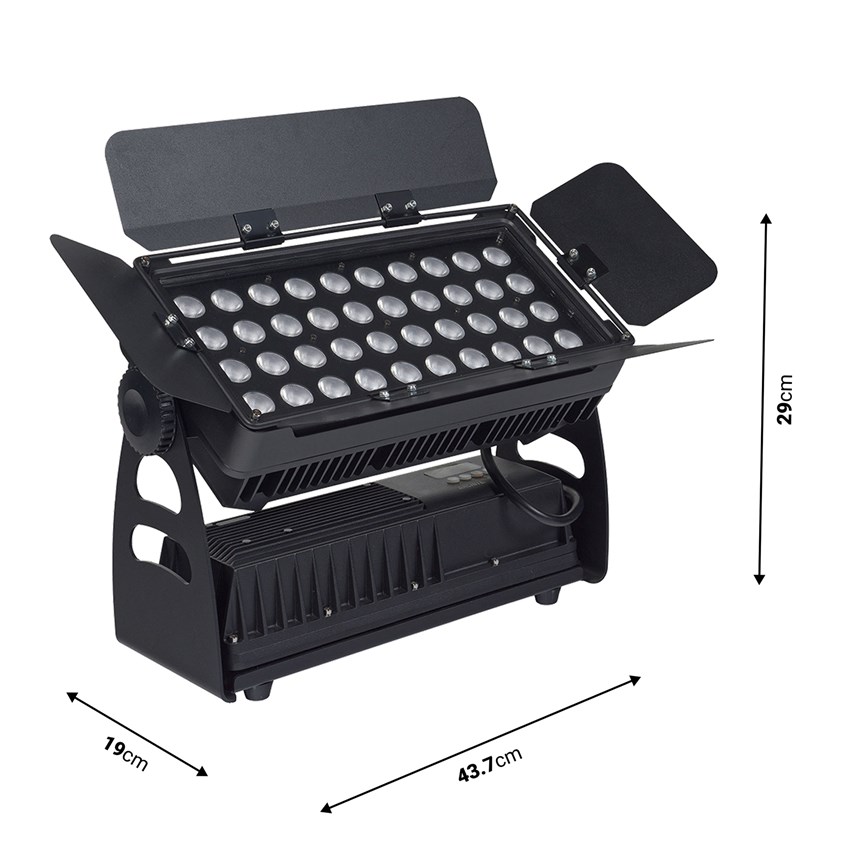 - PUISSANCE LUMINEUSE INTENSE : Équipé de 40 LED RGBW de 15W, ce projecteur délivre un flux lumineux puissant et des couleurs fidèles, idéal pour valoriser monuments, façades et grandes surfaces extérieures.