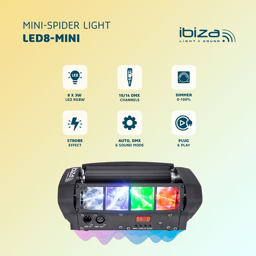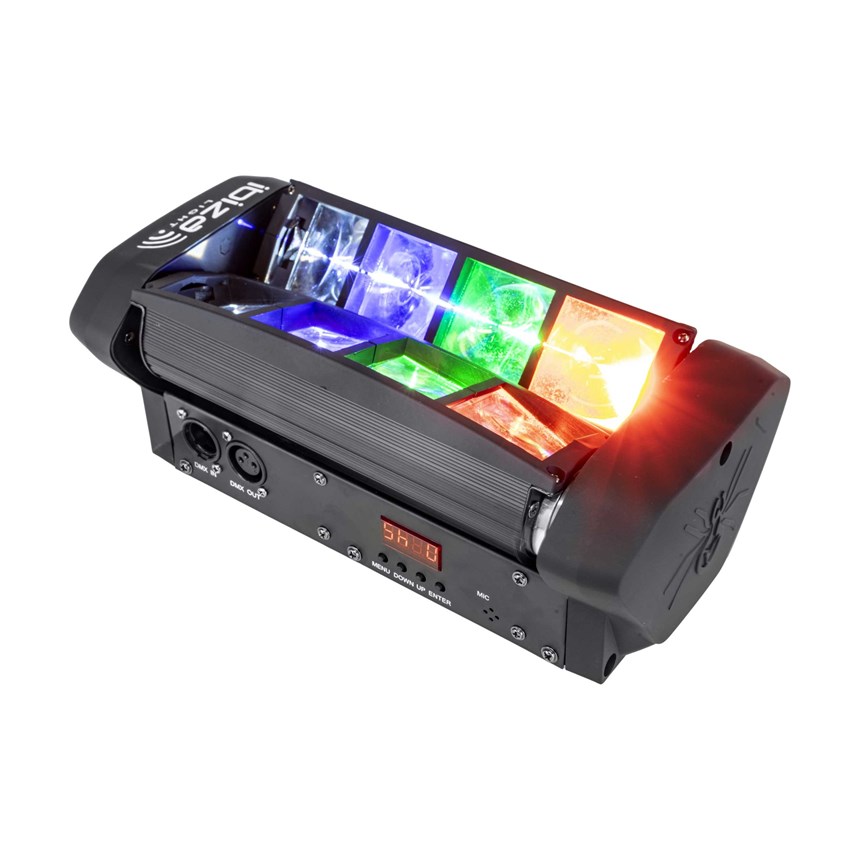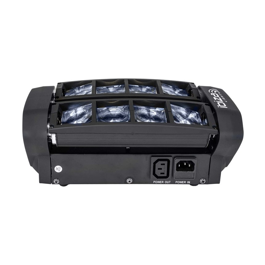 UN SPECTACLE LUMINEUX DYNAMIQUE POUR ENFLAMMER VOS SOIRÉES.Ce mini Spider LED offre 8 faisceaux ultra-puissants pour des effets visuels impressionnants. Contrôlable en DMX ou audio, il est idéal pour DJ, bars et clubs. Prêt à briller ?