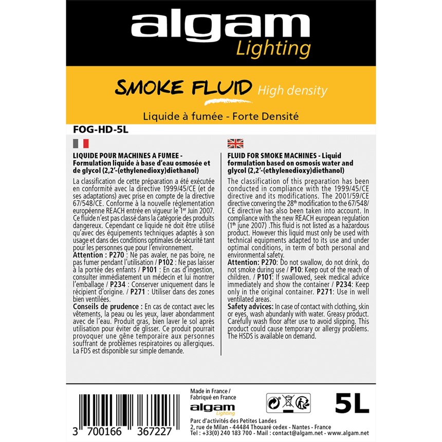 UNE FUMÉE INTENSE POUR UN EFFET SCÉNIQUE PROFESSIONNEL.Créez une atmosphère captivante avec une fumée dense, homogène et durable. Conçue pour les grandes salles et scènes, cette formule garantit un effet de voile spectaculaire. Son bidon de 5 litres combine performance et praticité pour toutes vos animations. Fabrication française conforme aux normes en vigueur.