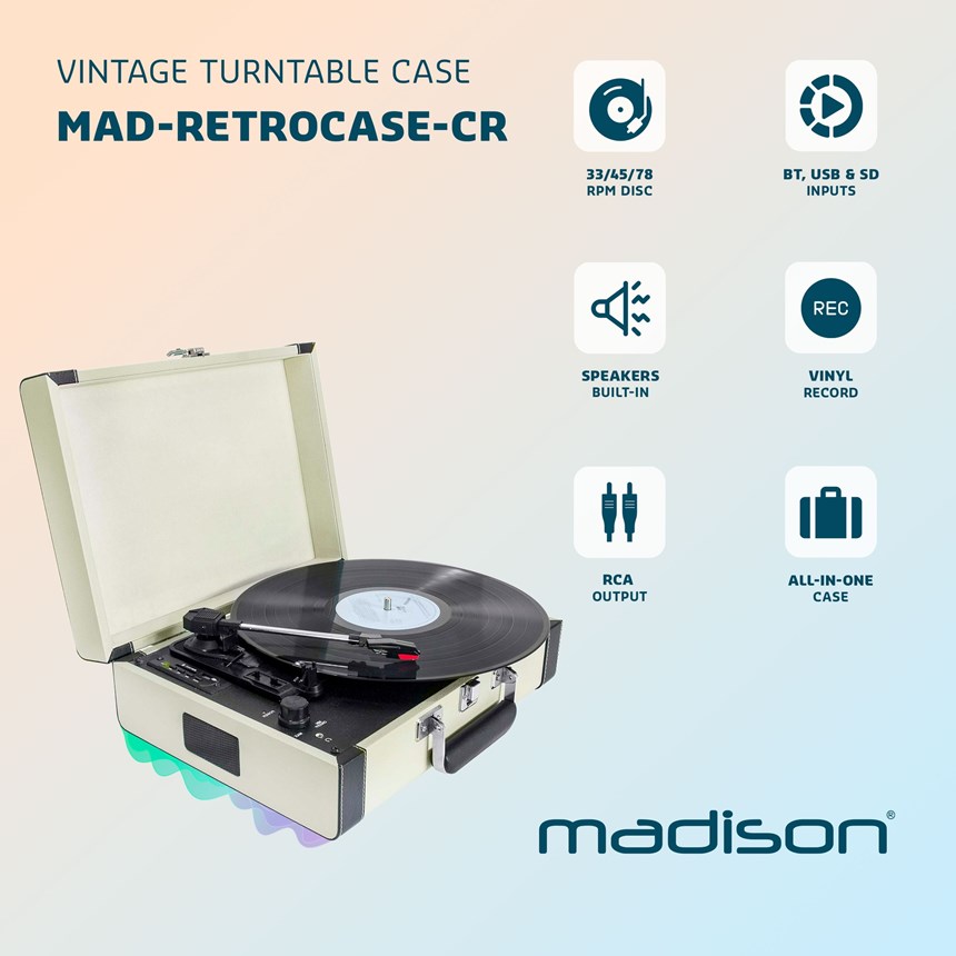 ÉCOUTEZ VOS VINYLES ET NUMÉRISEZ-LES AVEC STYLE.La platine MAD-RETROCASE-CR offre une expérience vintage complète avec fonction d’enregistrement sur USB/SD, haut-parleurs intégrés et BT. Une mallette élégante pour redonner vie à votre collection.