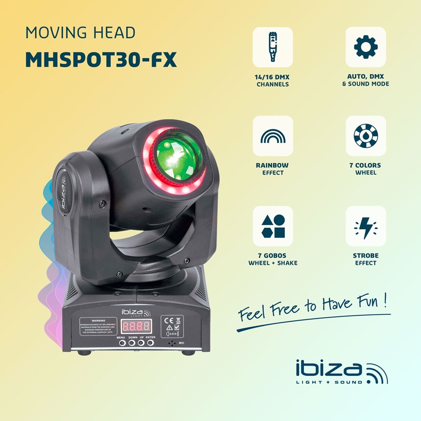 UN EFFET LUMINEUX 2-EN-1 POUR DES SHOWS DYNAMIQUES ! Associez la puissance d’un spot LED blanc 30W (roue de 7 couleurs et effet Rainbow pour des effets multicolores) avec un anneau RVB animé pour des effets spectaculaires.