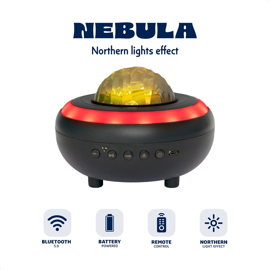 EFFETS LUMINEUX POLAIRES POUR AMBIANCES UNIQUES ! Cette enceinte compacte combine un son BT et des projections RVB pour créer une atmosphère magique.Parfaite pour la relaxation ou la fête, elle s’utilise partout et se pilote avec sa télécommande.
