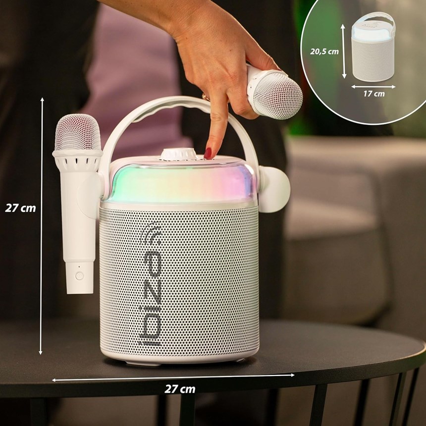 Mettez l’ambiance avec le KARAHOME-WH, l’enceinte karaoké nomade de 120W avec deux micros sans fil rechargeables !