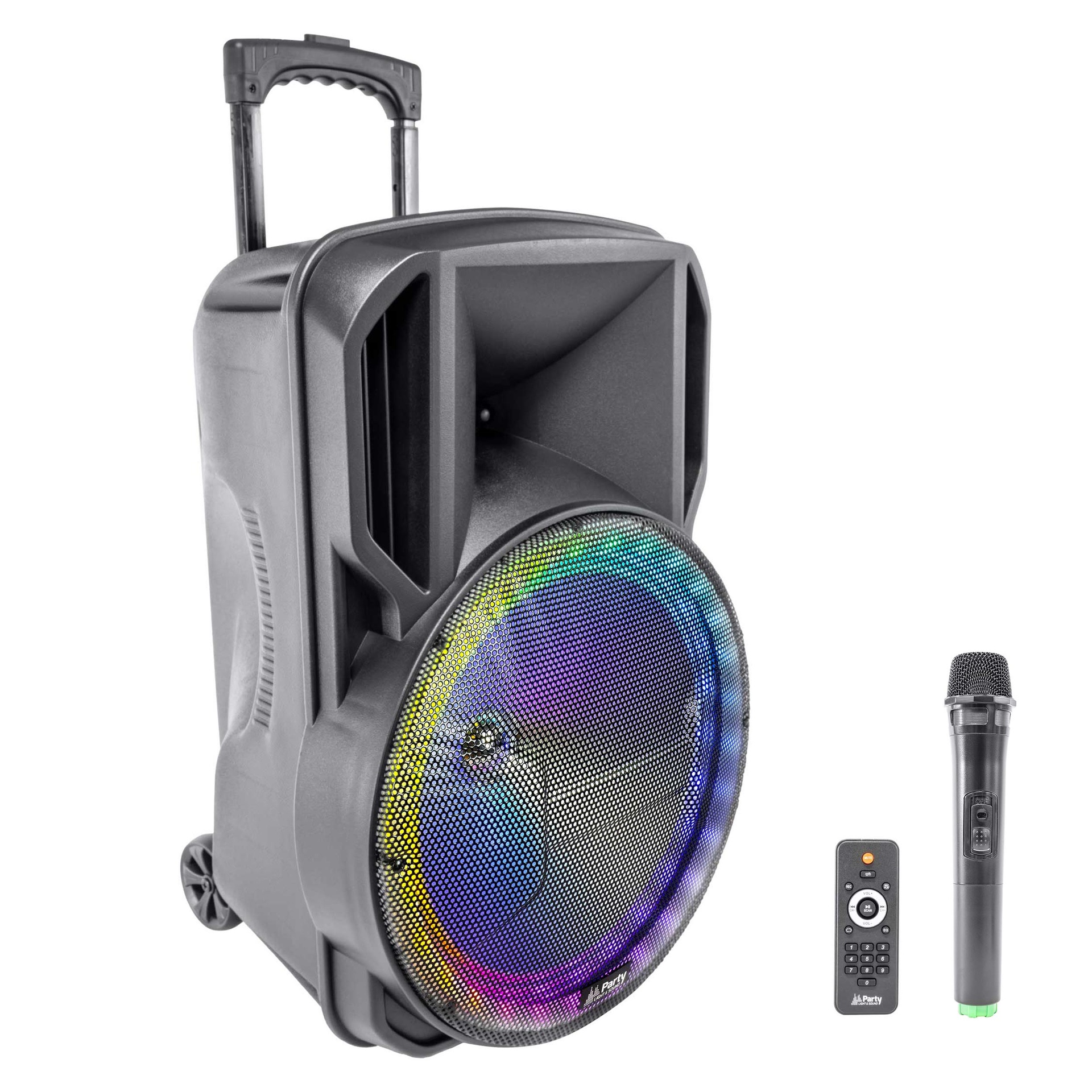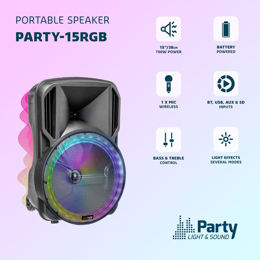 EFFETS LUMINEUX RVB POUR UNE AMBIANCE FESTIVE INSTANTANÉE ! Transportez votre musique partout avec cette enceinte 15'' autonome, équipée de LED multicolores, BT, USB, micro SD, micro sans fil et télécommande.Le tout avec une batterie rechargeable pour des heures de son !