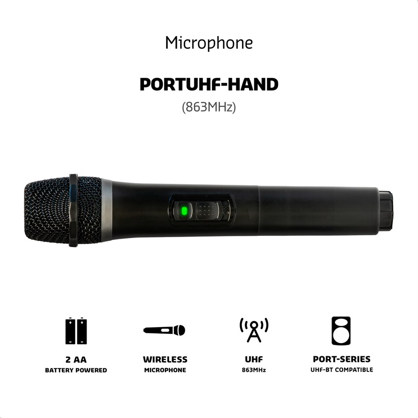 MICROPHONE À MAIN UHF POUR SYSTÈMES PORTABLES PORT - UNE COMPATIBILITÉ PARFAITE POUR LA GAMME UHF-BT.Profitez d’une portée étendue, d’un son clair et d’une installation instantanée avec ce micro conçu spécialement pour compléter vos enceintes PORT.