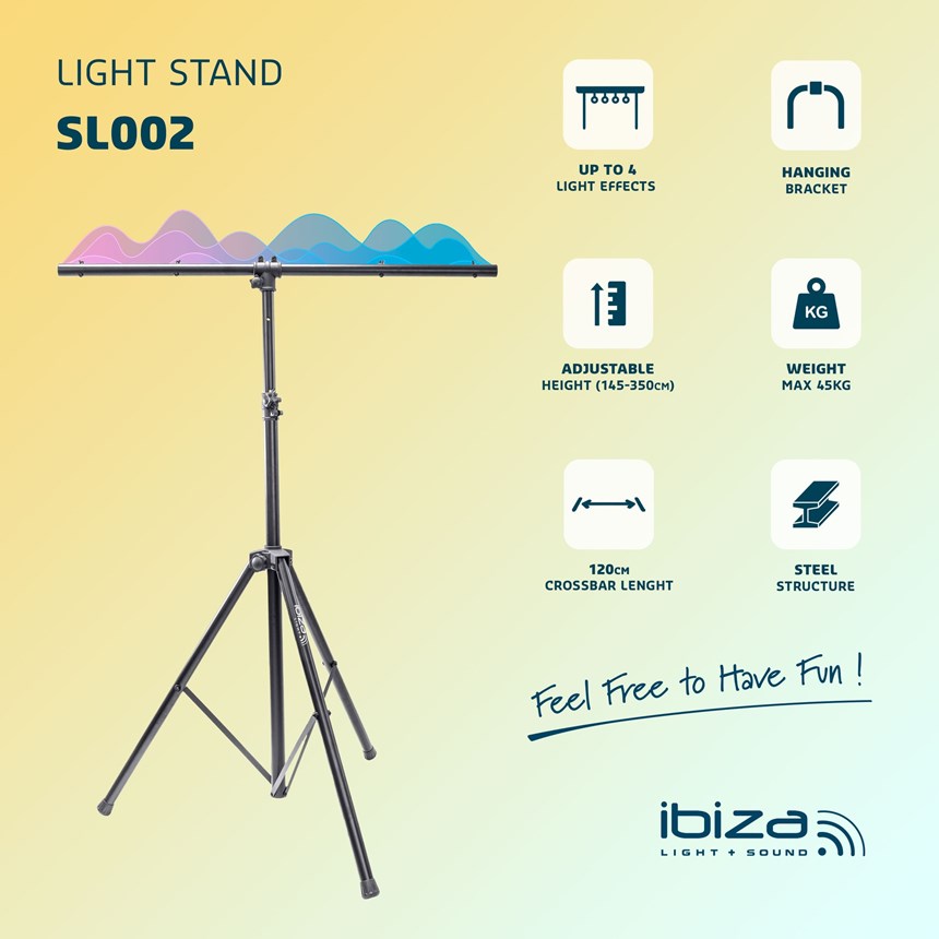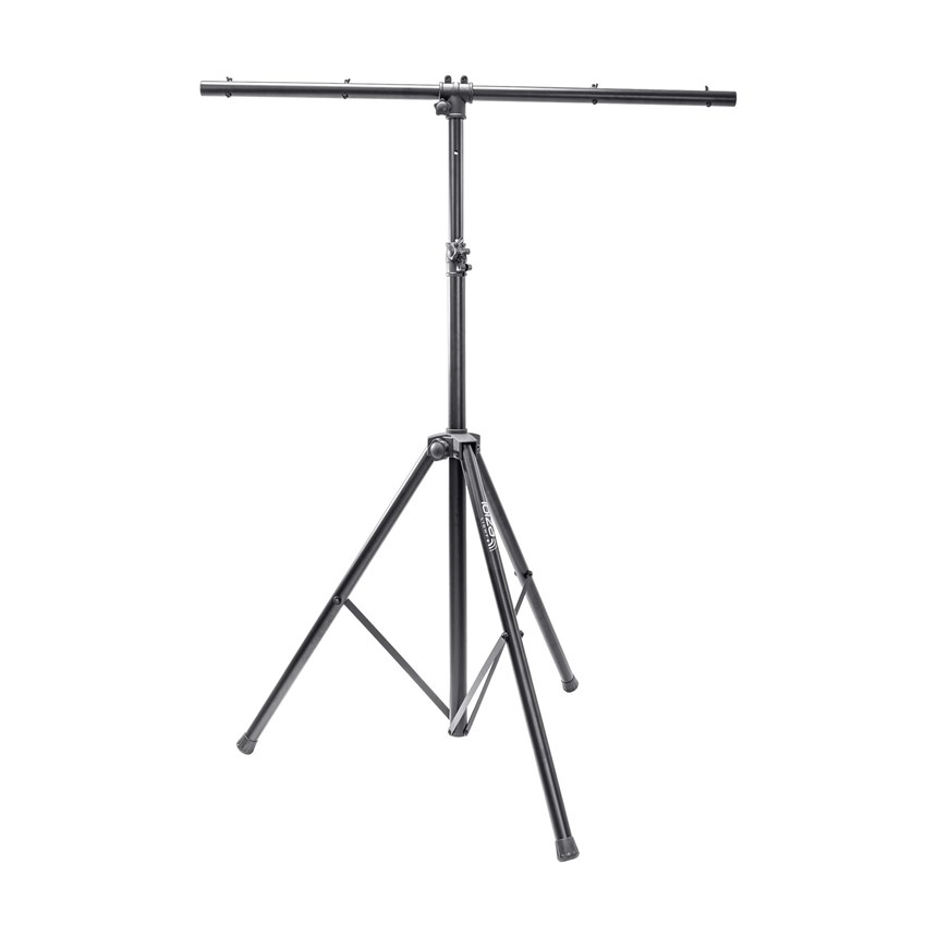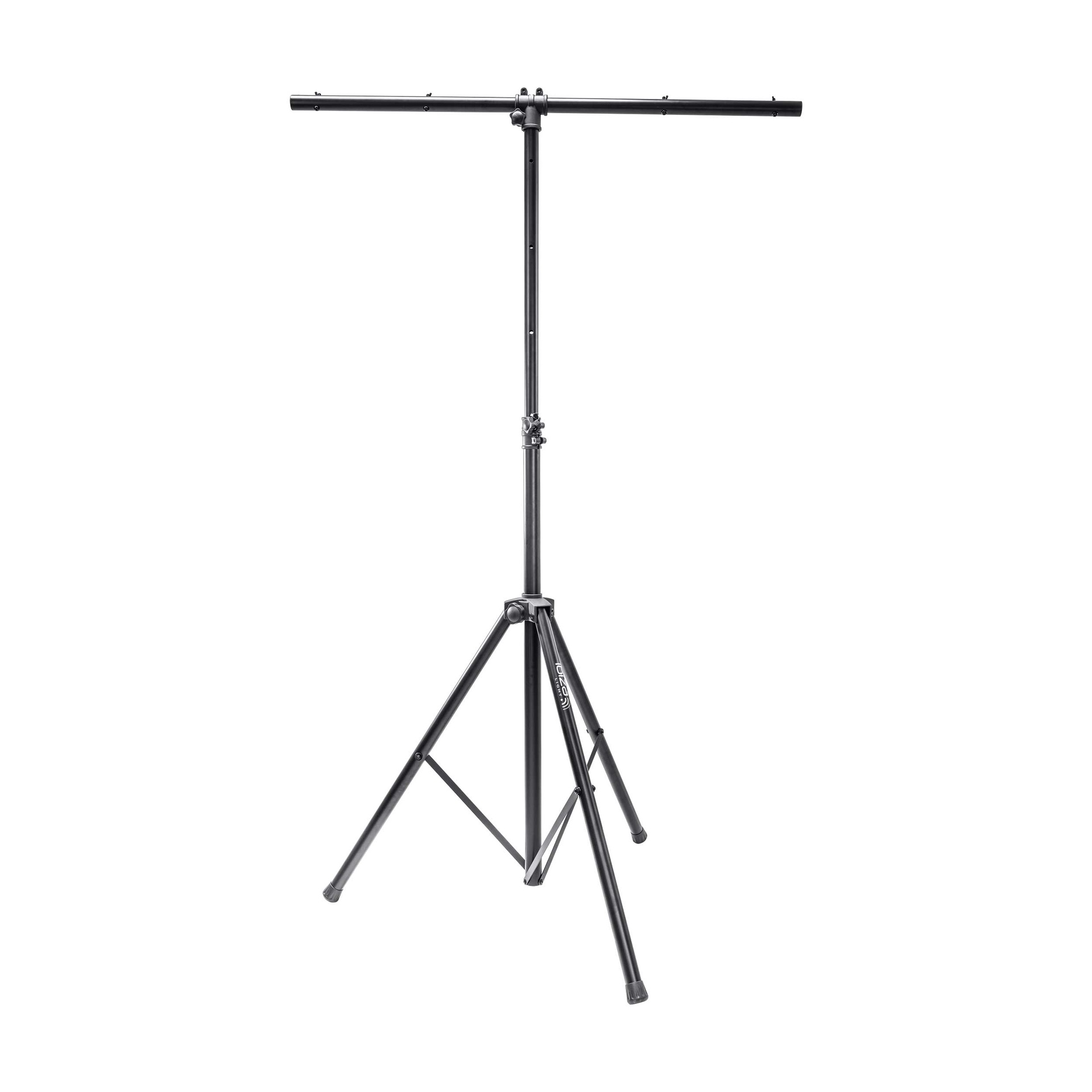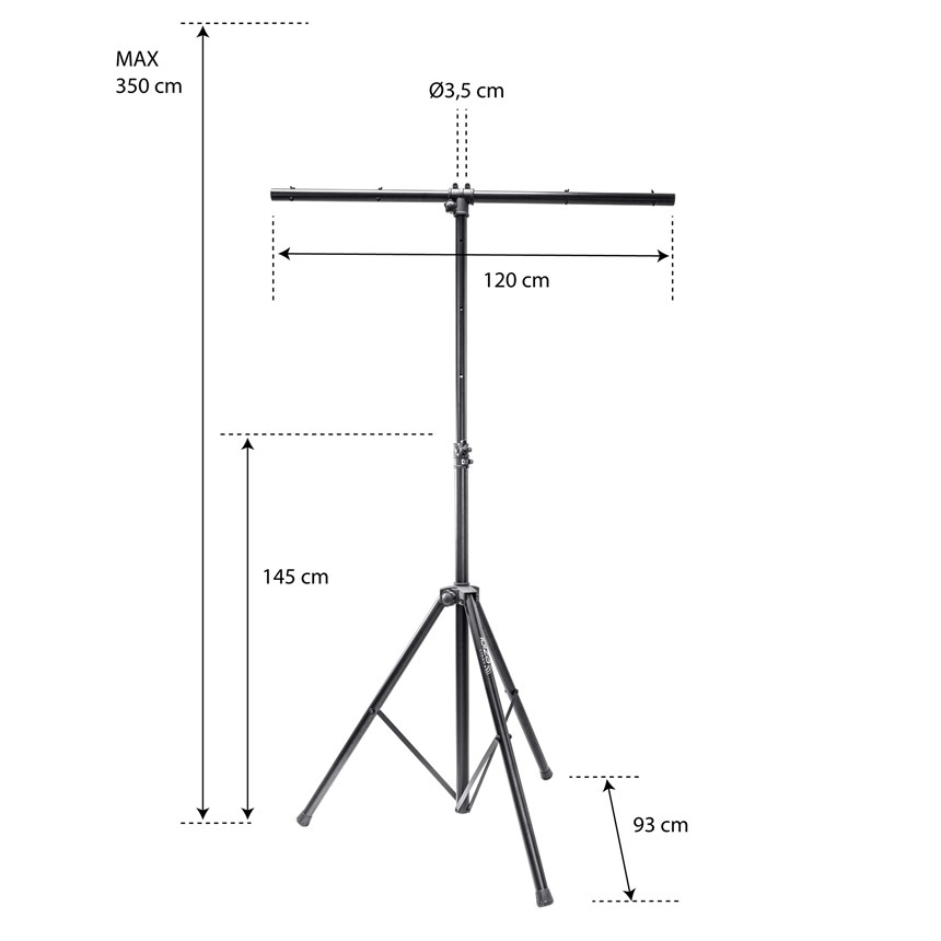 SUPPORT TRÉPIED LUMIÈRE POUR 4 PRODUITS - RÉGLABLE & ROBUSTE.Ce support d’éclairage avec barre en T vous permet de fixer jusqu’à 4 jeux de lumière en toute stabilité. Réglable jusqu’à 3,5 mètres de hauteur, il convient à toutes les configurations de scène ou de soirée.