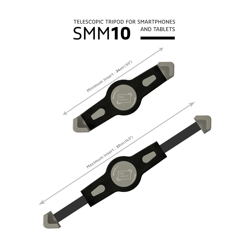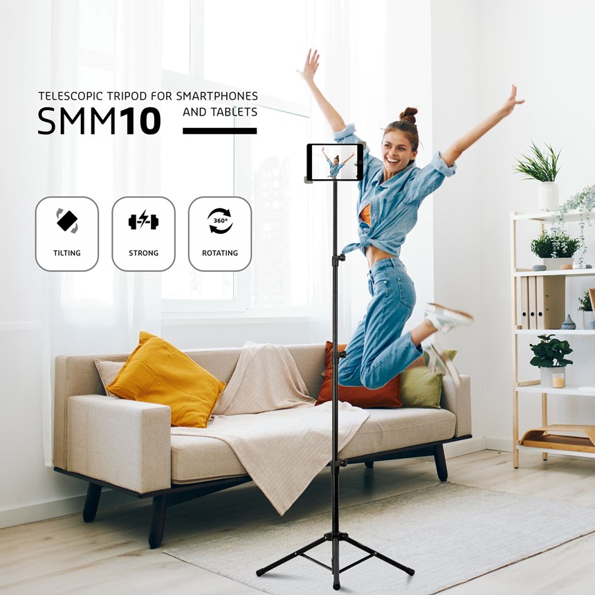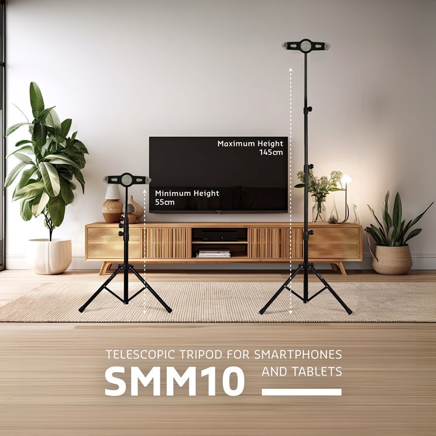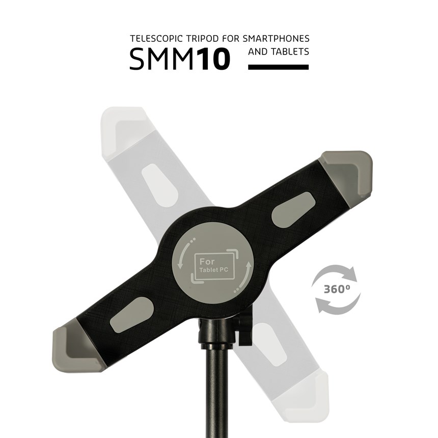 ADAPTEZ VOTRE TABLETTE À TOUTES LES CONFIGURATIONS.Le SMM10 est un trépied télescopique pensé pour les pros : hauteur réglable, tête rotative 360°, pince anti-rayure et sac inclus. Idéal pour les présentations, stands, musiciens ou créateurs de contenu.