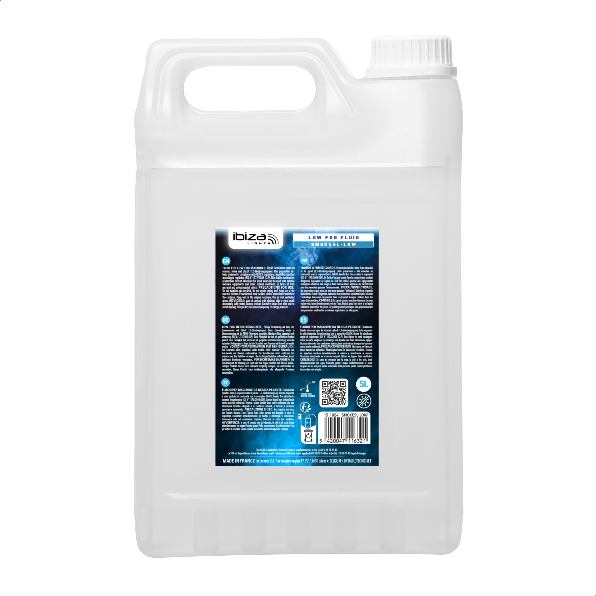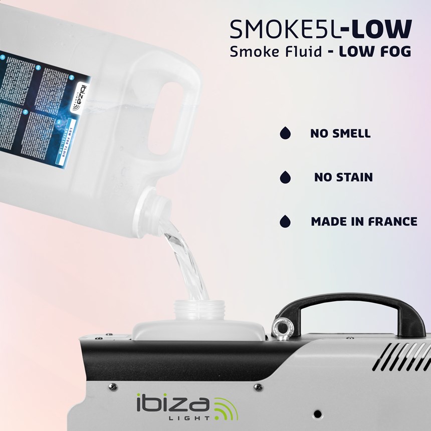 - SMOKE5L-LOW : Liquide à fumée qui va couvrir votre sol d’une épaisse fumée blanche et opaque. (bidon de 5L). ATTENTION : Compatible uniquement avec les machines à fumée lourde à base d'eau.