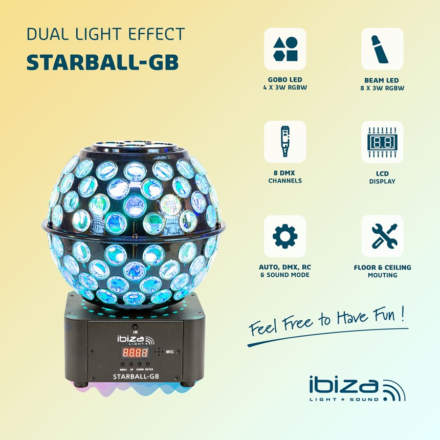 UN DOUBLE EFFET LUMINEUX POUR UNE AMBIANCE INOUBLIABLE.Profitez de projections dynamiques de gobos et de faisceaux puissants RVBB pour sublimer vos soirées. Contrôle total via DMX, son ou télécommande. À poser ou suspendre selon vos besoins.