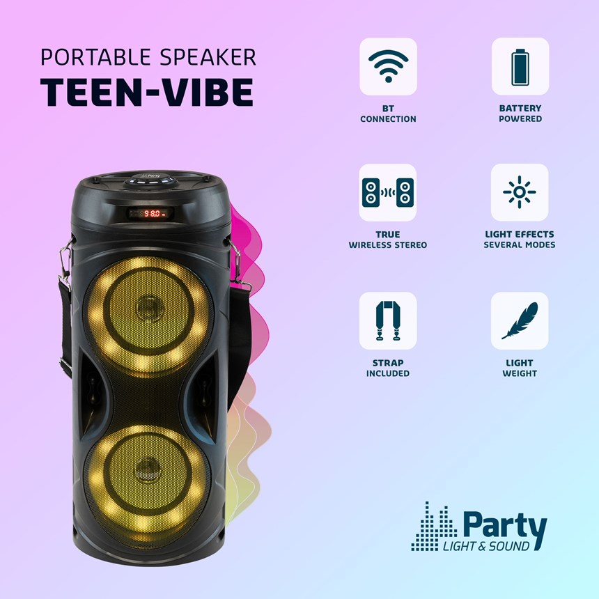 FAITES VIBRER VOS MOMENTS AVEC L’ENCEINTE TEEN-VIBE ! Cette enceinte compacte et puissante embarque tout ce qu’il faut : BT, USB, FM, LED, TWS, batterie, pour ambiancer vos soirées partout.Elle est prête à jouer en un instant.